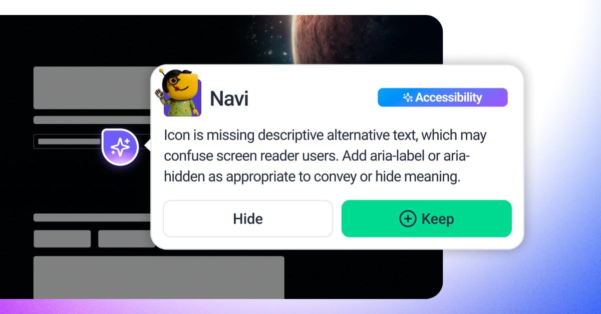 Navi helps your team spot friction before your users do. Whether it’s a missing label, a confusing CTA, or an unintuitive flow, she flags what hurts conversion and inclusivity. Bring Navi into your review cycle early and often to deliver smarter, more accessible user journeys that reduce frustration and increase engagement.