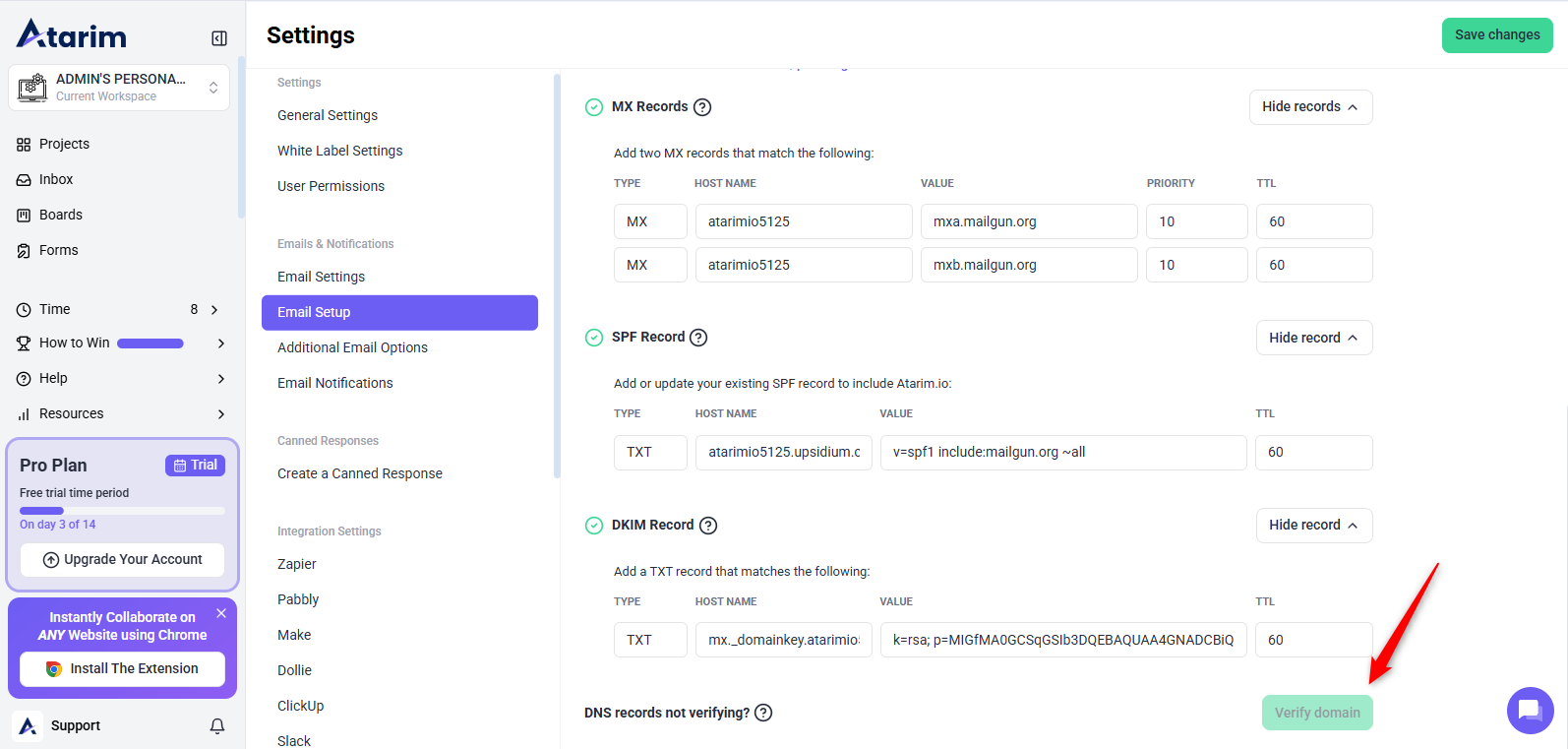 To ensure smooth email communication through app.atarim.io, you need to verify your domain by adding DNS records. This authentication process improves email deliverability, prevents spoofing, and allows you to customize your tracked links.