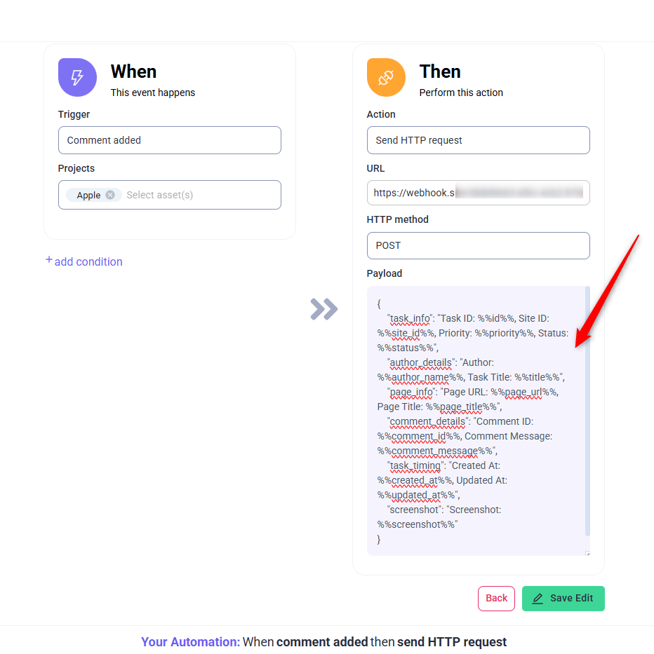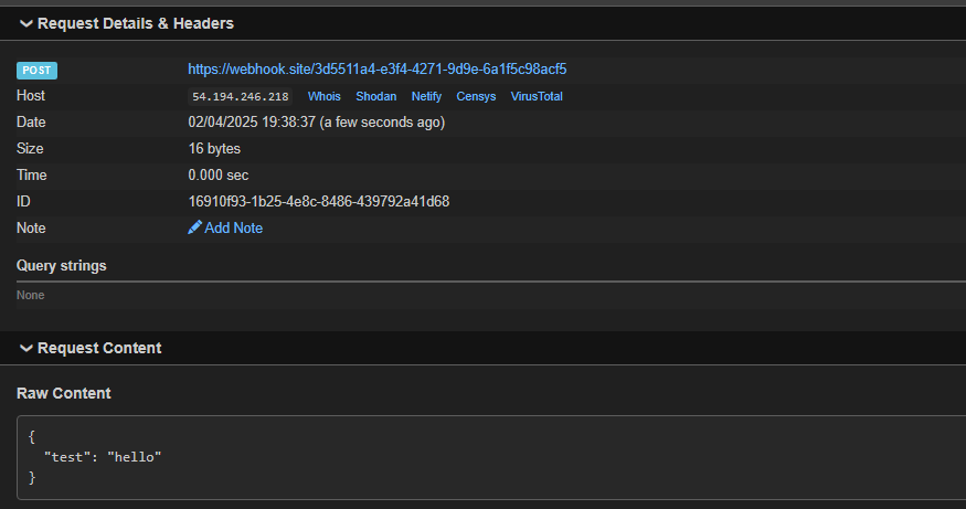 Tip: Once your test works correctly in Webhook.site, replace the URL with your live endpoint.