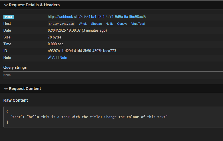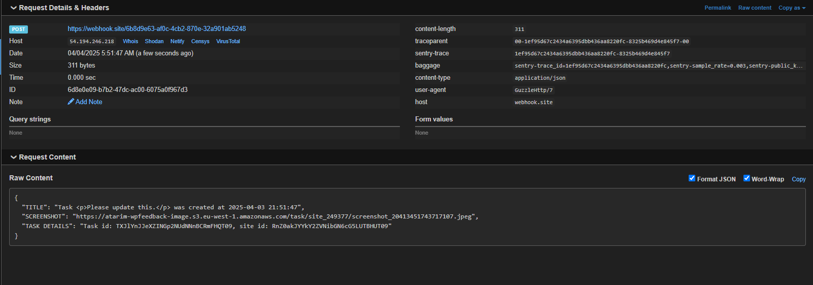 Example 2 – Dynamic Payload including Task Title, ID, Created At, and Screenshot.