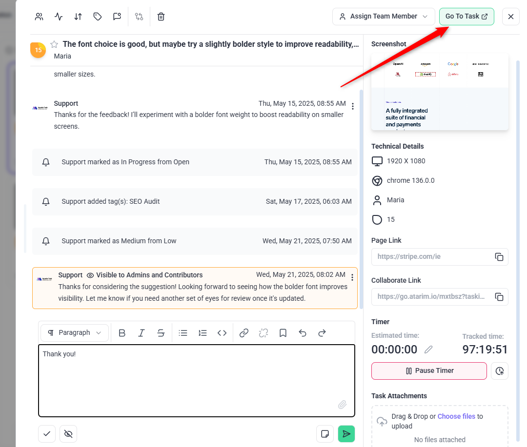 - Technical Details: Displays browser, OS, screen size, and task creator.