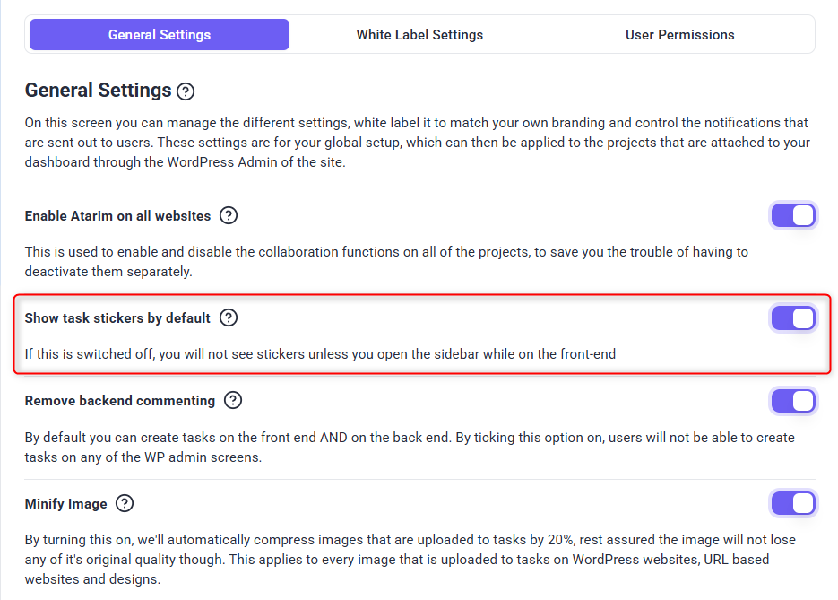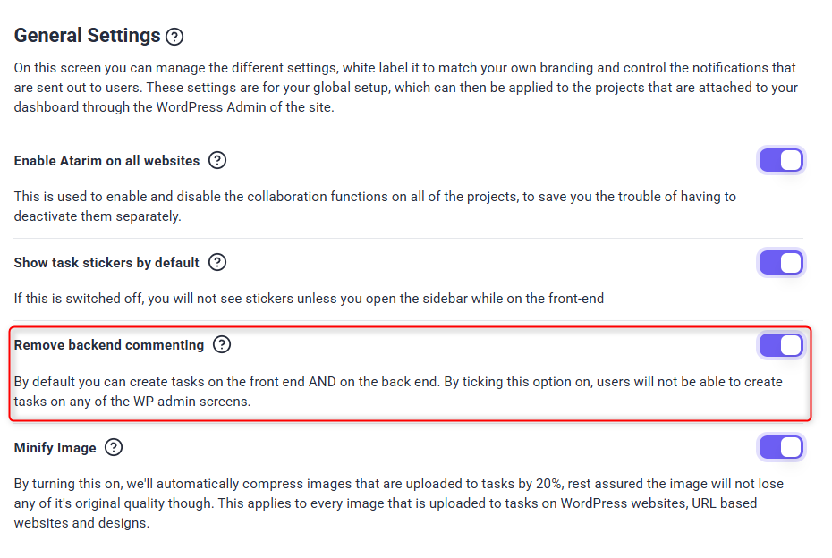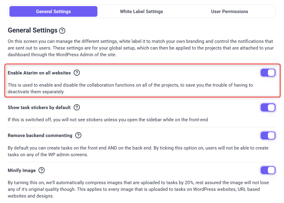 • Toggle Atarim On/Off for all WordPress websites with global settings enabled.