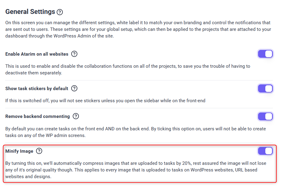 3. Once enabled, Atarim will automatically compress images uploaded via the collaboration tool.