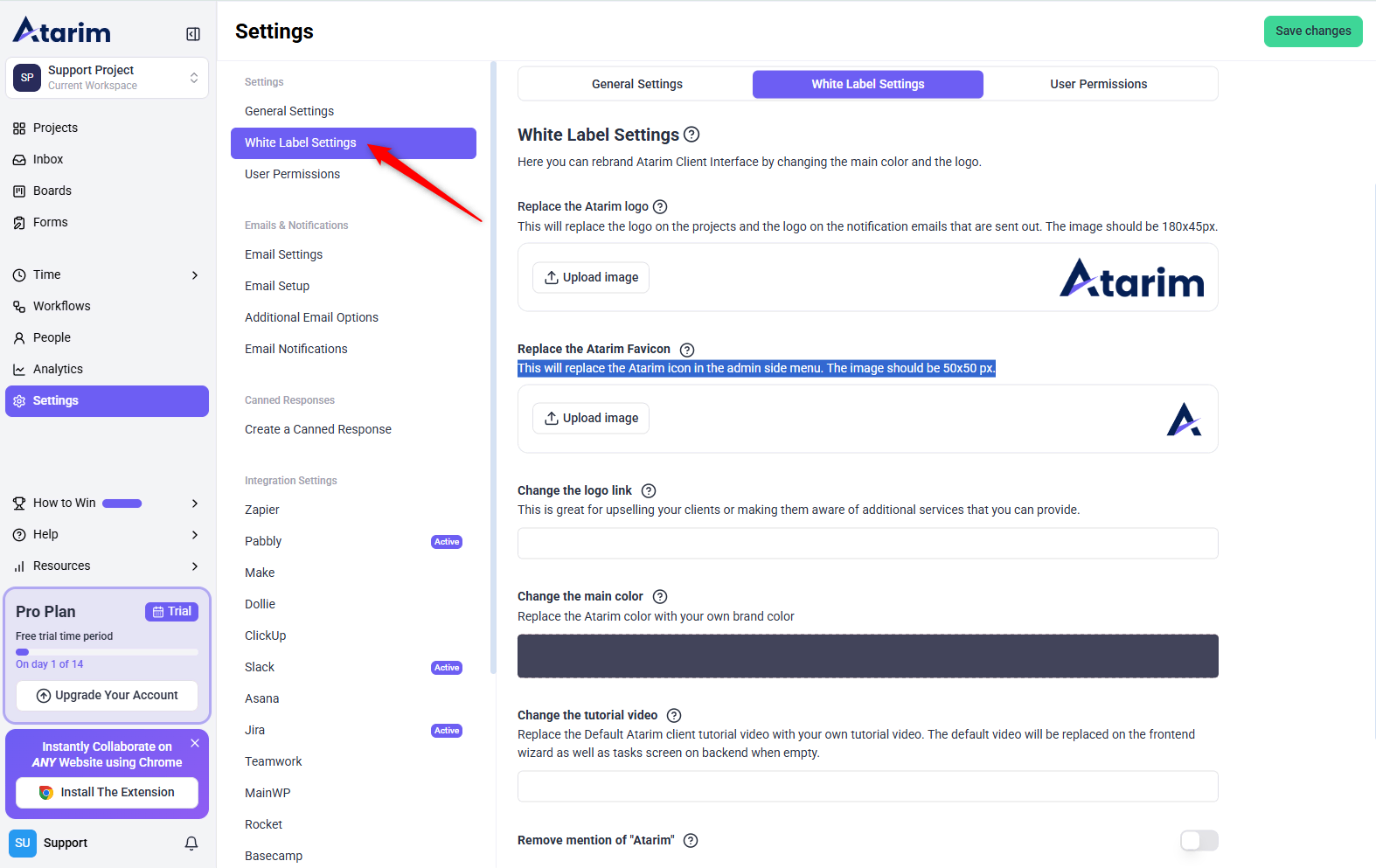 To start white-labeling your Atarim workspace, access the White Label settings from the dashboard.