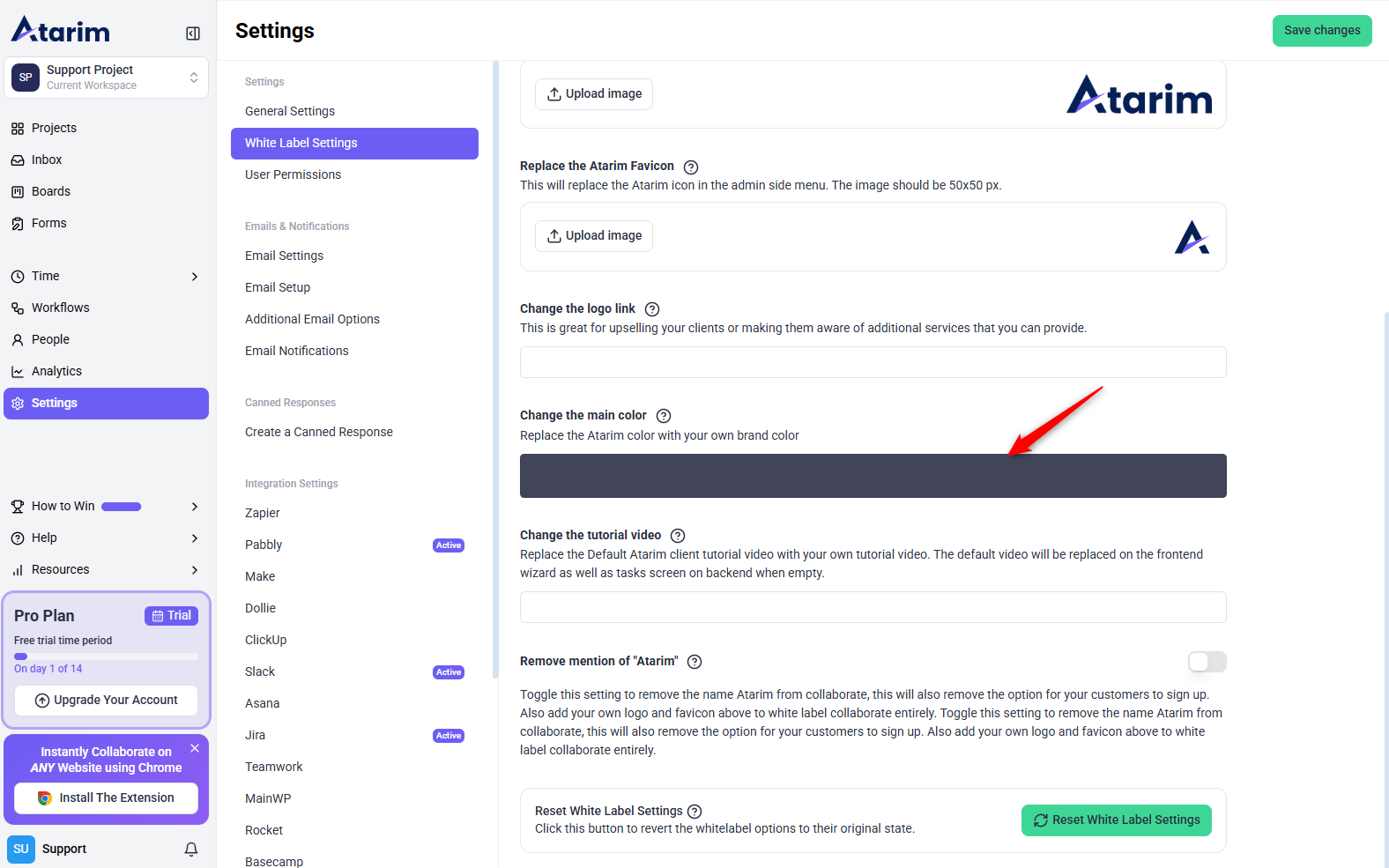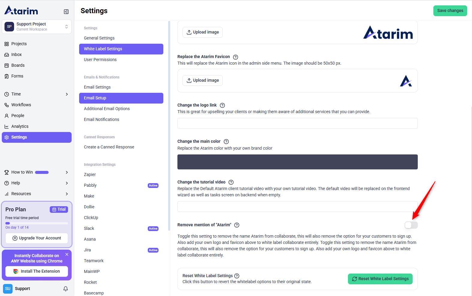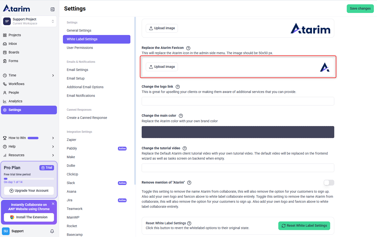 Resetting White Label settings will revert all branding changes back to Atarim’s default.