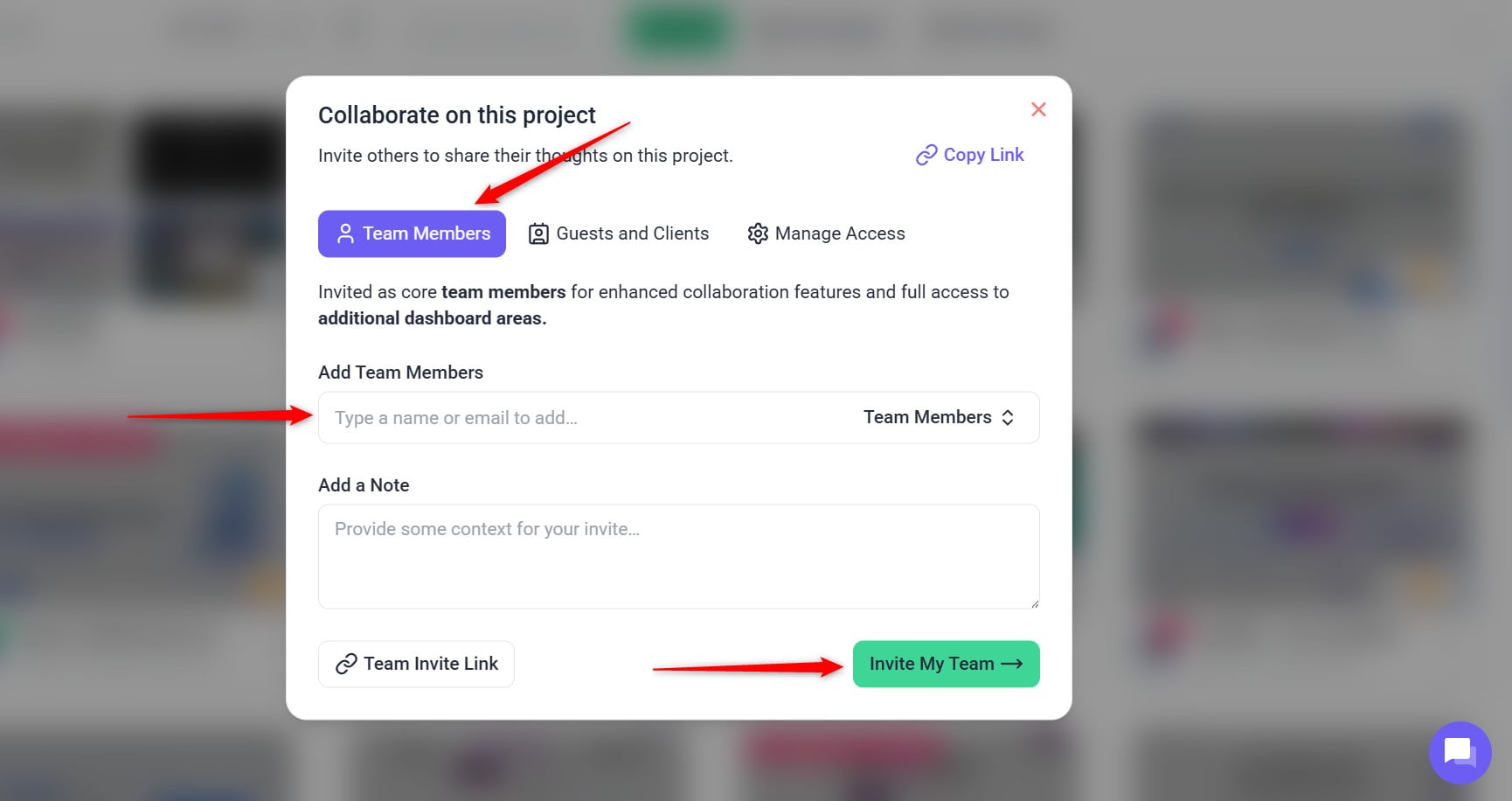 Atarim allows you to collaborate with internal teams as well as external clients and stakeholders. You can invite users to your workspace to start collaborating on tasks and feedback. Learn How To Invite Team Members or clients.