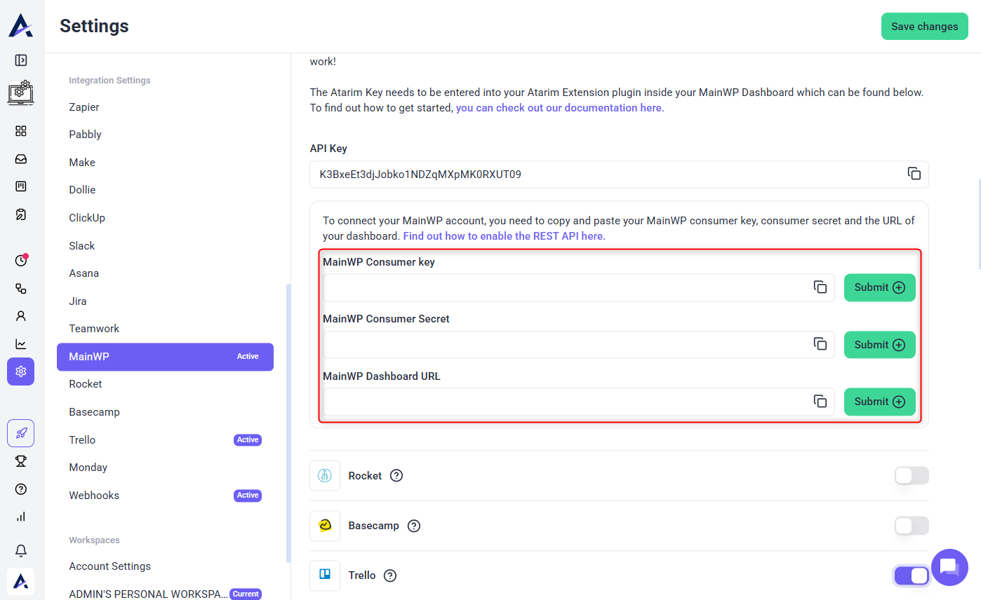 After generating the keys for your MainWP Dashboard, go to the integration settings section inside your Atarim Dashboard. You should have already enabled the MainWP integration in the previous step.