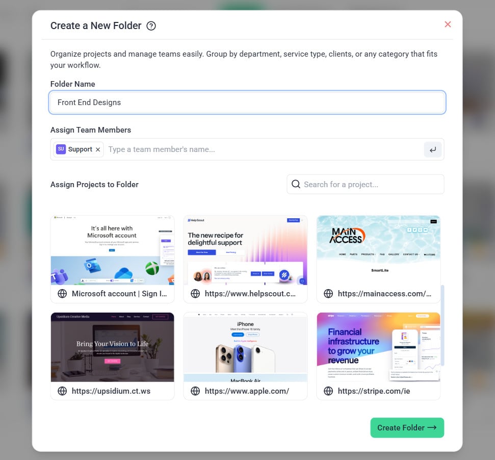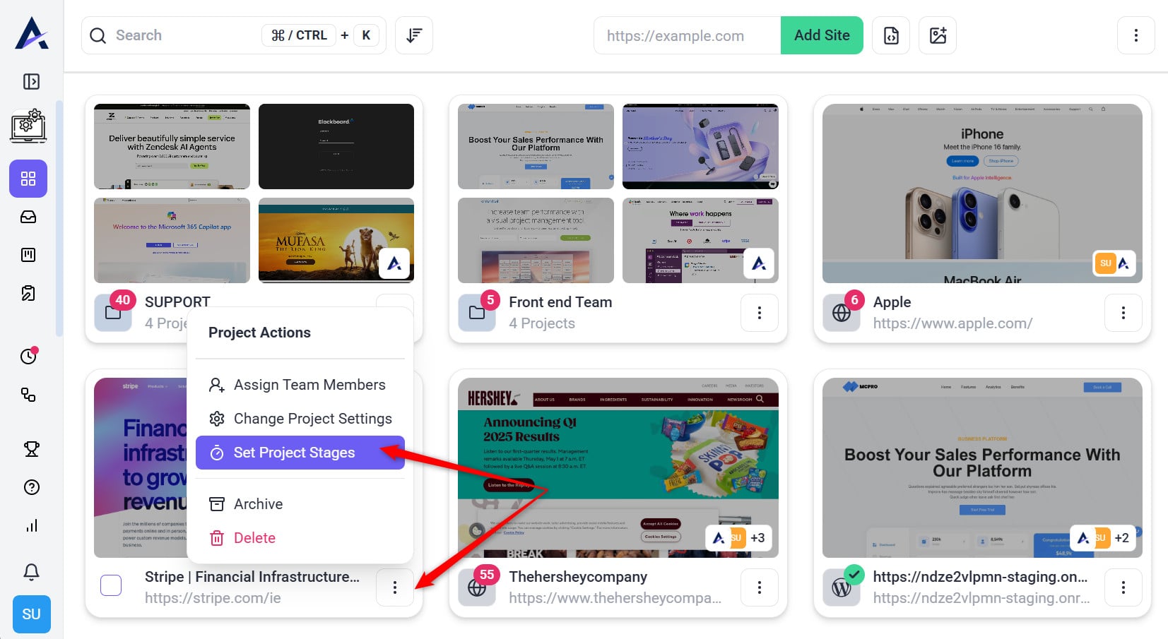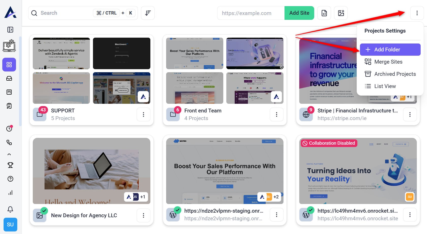 - Add projects using the URL, WordPress plugin, or design upload options.